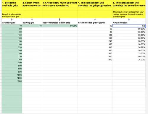 Have you ever wondered what the optimal grit progression is if you are aiming for a 25% increase at every step? Or a 50% increase? Wonder no more! This spreadsheet will calculate it all for you: